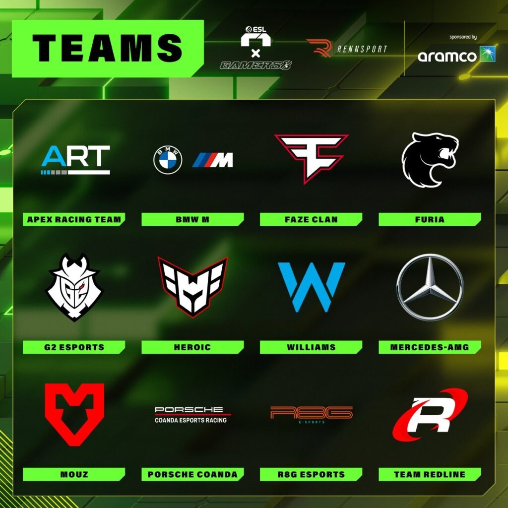 There are 12 teams on the grid: Apex Racing Team, BMW M, Faze Clan, Furia, G2 Esports, Heroic, Mercedes-AMG, Mouz, Porsche Coanda, R8G Esports, Team Redline and Williams. Each outfit competes with one of the following cars: either Audi, BMW, Mercedes or Porsche.