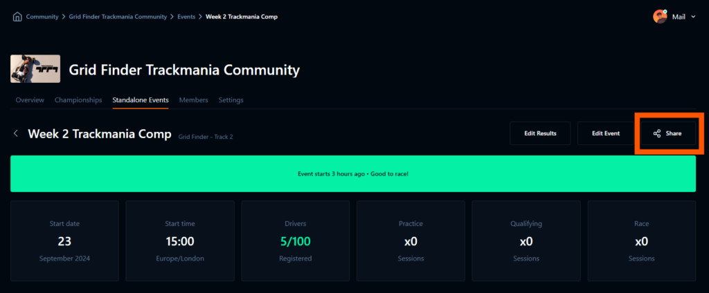 7. After that you have set up your first Trackmania Event. And to view your event page click “share”, and send the link to your friends!