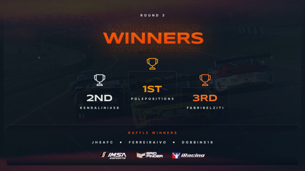 3 winners have been selected out of over 2673 raffle entries for Round Three. To remind you, just by completing one lap on iRacing and having a Grid Finder account linked to iRacing, you are in with a chance of taking home some amazing IMSA Prize’s this season! Every lap you complete, adds your name another time into the hat!