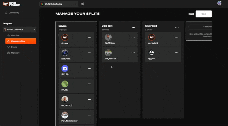 This time we’ve built a whole new split management system (F1 league managers would know this as a Tier management system!). This allows you to drag and drop drivers between splits/tiers before your season starts and mid-season, with results being carried over.