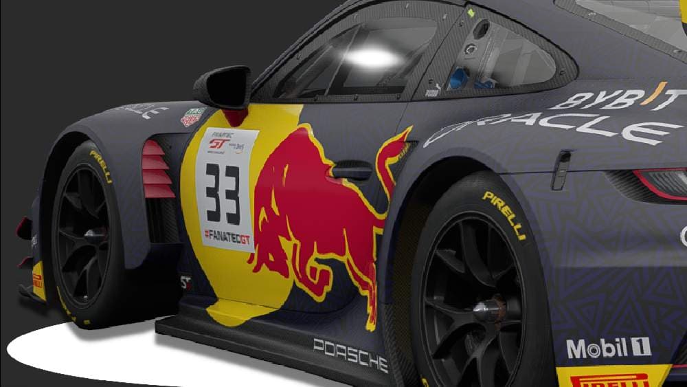 Introducing the jaw-dropping livery for the Porsche 992 GT3 R—a perfect fusion of bold design and cutting-edge motorsport performance. Draped in an elegant dark gray base, this livery embodies a modern and aggressive aesthetic, with the unmistakable Red Bull logo emblazoned proudly on the side. The iconic red and yellow bull, charging forward, adds a dynamic sense of energy and motion, even when the car is standing still.