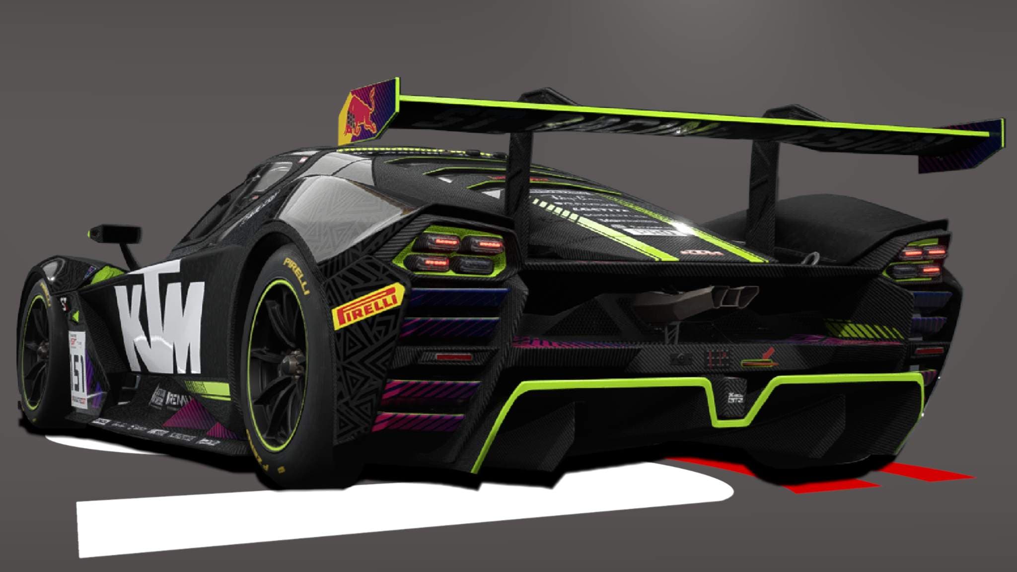 Introducing the sleek and dominating livery for the KTM X-BOW GT2 that fuses bold design with cutting-edge performance. Dressed in a powerful, deep black, this livery demands attention with sharp neon green and purple accents that slice through the darkness, making a statement on the track. The electric green highlights along the front splitter and roofline emphasize speed and agility, while the purple details along the lower side panels give it a futuristic, otherworldly edge.