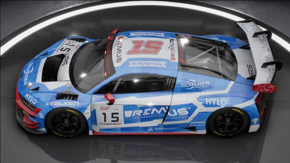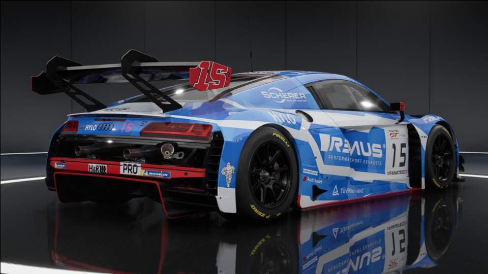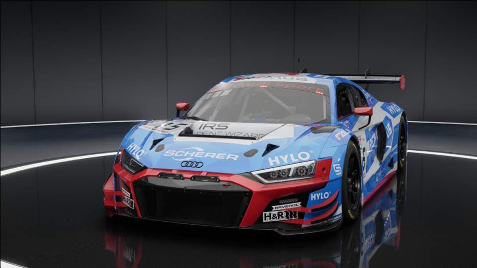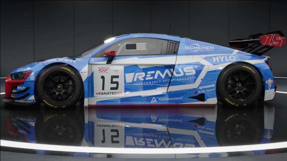 The Scherer Sport PHX Audi R8 LMS Evo 2 #15 livery is a stunning blend of performance-inspired aesthetics and cutting-edge design. This car wears a striking blue, white, and red color scheme that screams motorsport excellence. The livery seamlessly merges key sponsor logos like REMUS, HYLO, Falken, and Scherer into its dynamic design, highlighting the collaboration between top-tier brands and world-class racing.