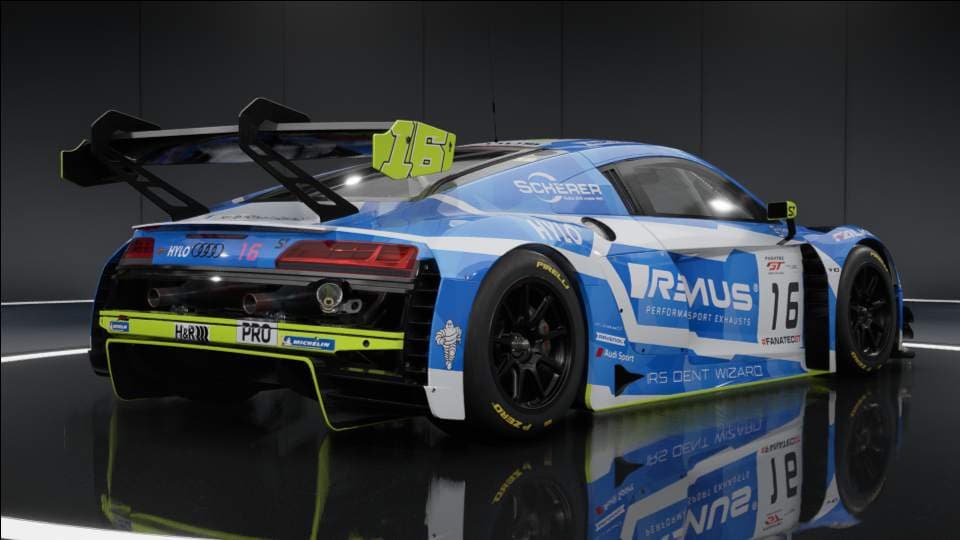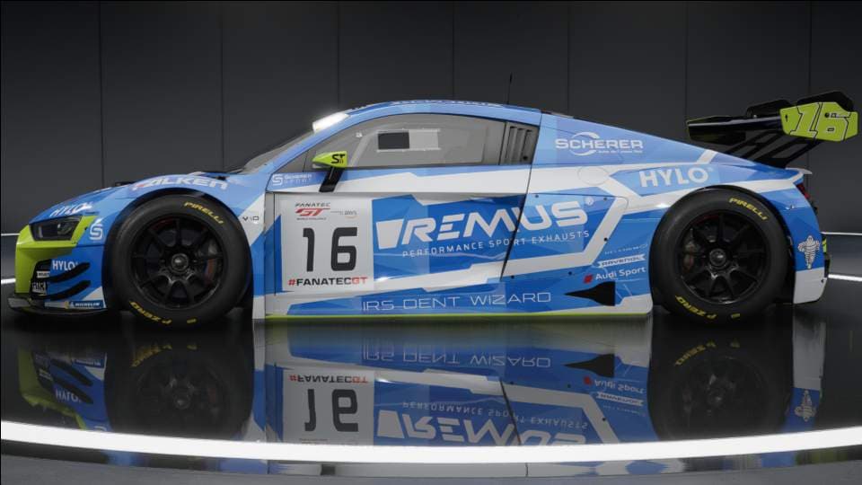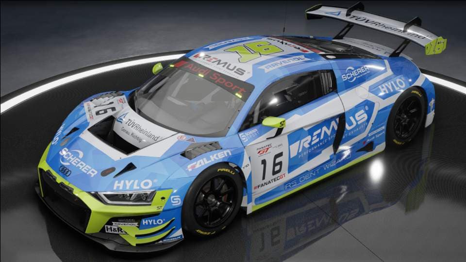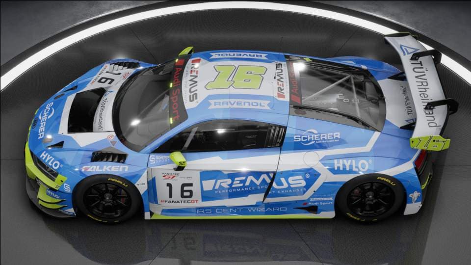 The key sponsors—REMUS, HYLO, TÜV Rheinland, and Falken—are prominently showcased across the bodywork, seamlessly integrated into the livery's flow. The livery’s aerodynamic lines and sharp design elements complement the high-performance Audi R8 LMS Evo 2, making the car look as fast as it drives.