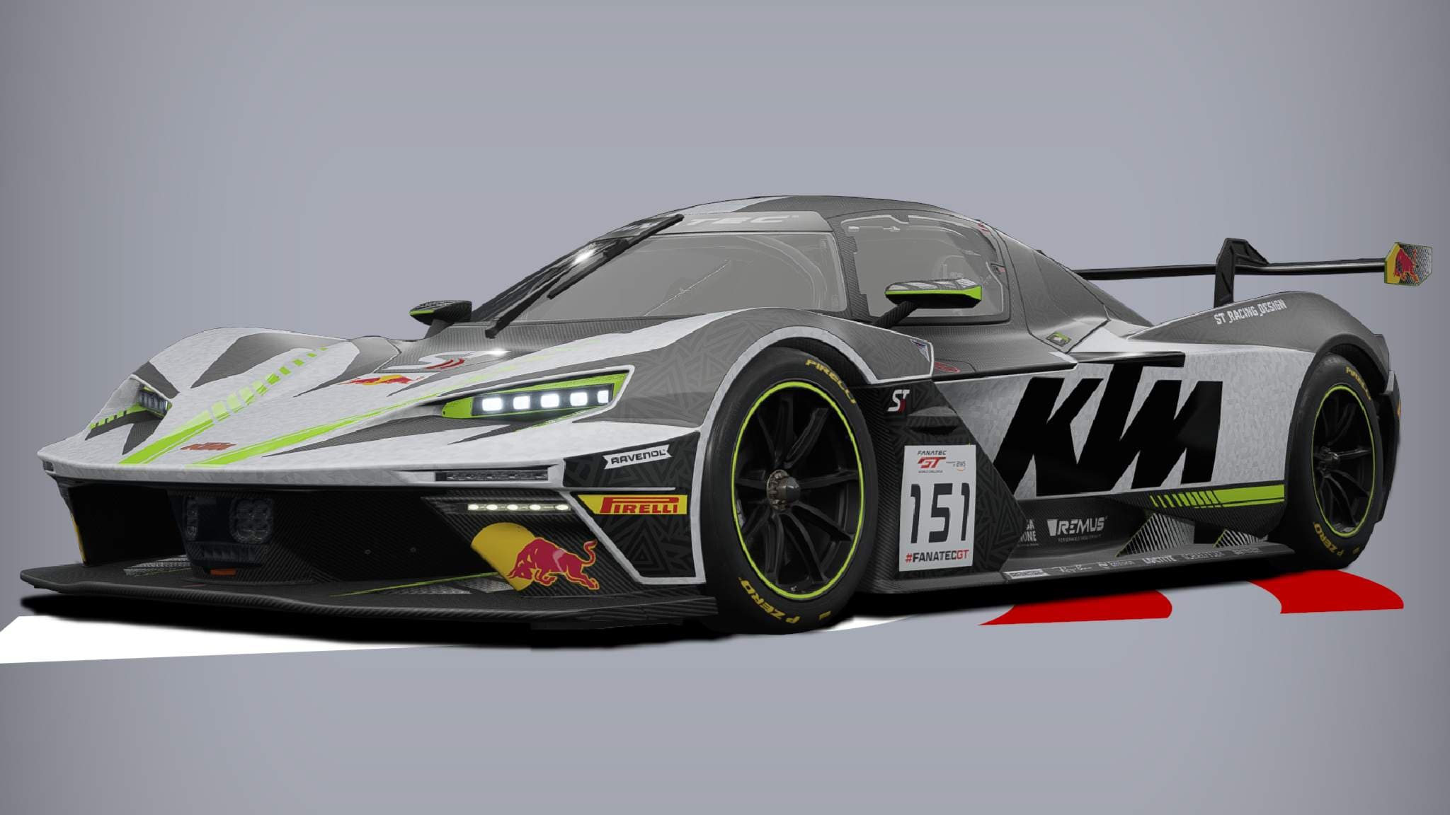 The bold KTM branding across the side panels is impossible to miss, exuding a sense of technical precision and engineering excellence. The neon green accents on the rims and mirrors provide a futuristic flair, while the subtle geometric patterns woven throughout the body offer a sophisticated touch. This car's aggressive stance, enhanced by its matte and carbon fiber details, screams dominance and authority.