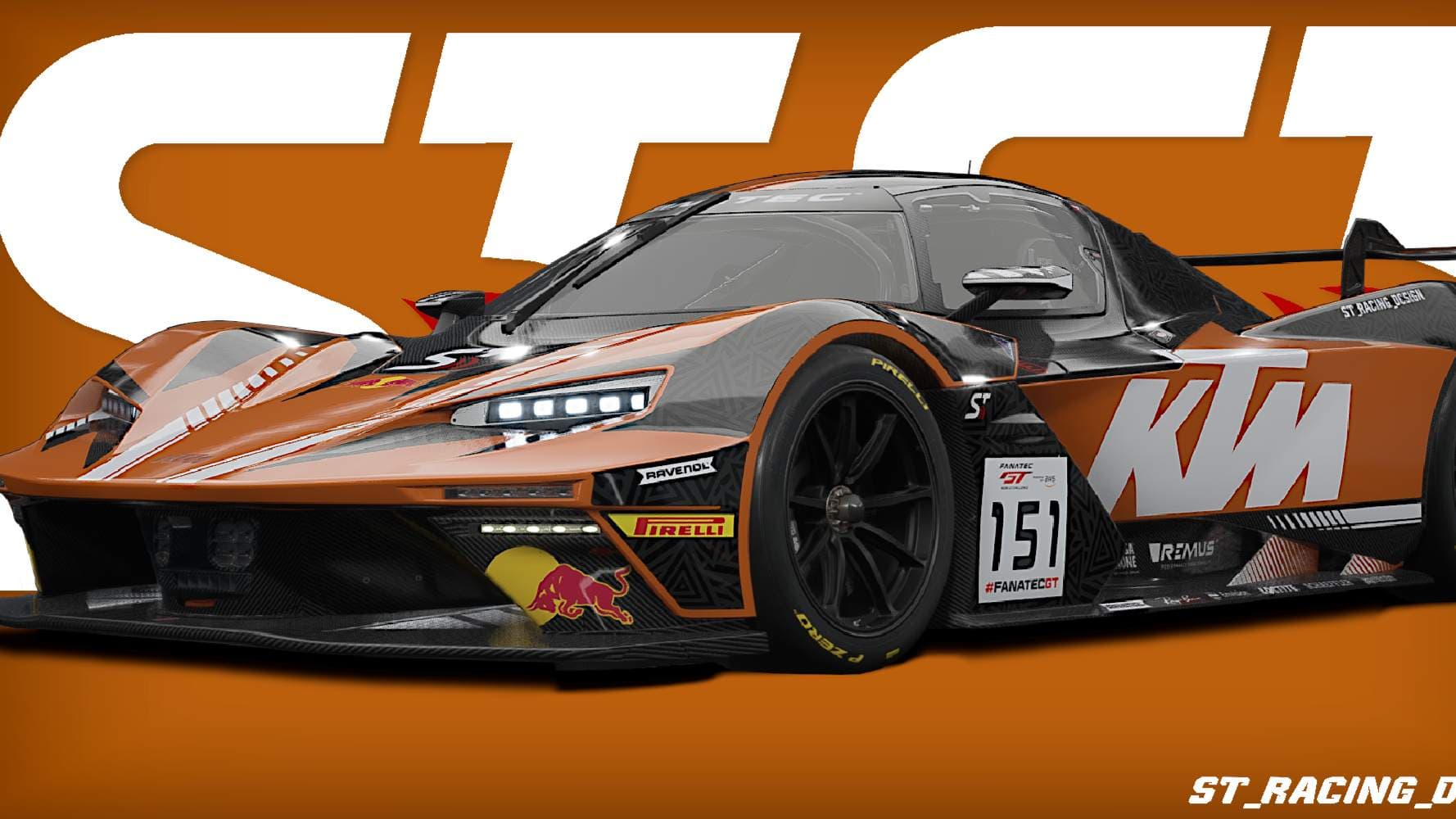 The iconic KTM logo stands tall in crisp white, dominating the side of the car, a testament to KTM's legacy of innovation and performance. Striking geometric patterns subtly weave into the livery’s design, giving it an added layer of sophistication and depth. Meanwhile, the black carbon fiber detailing reinforces the car’s lightweight build and dedication to speed, ensuring both form and function are on full display.